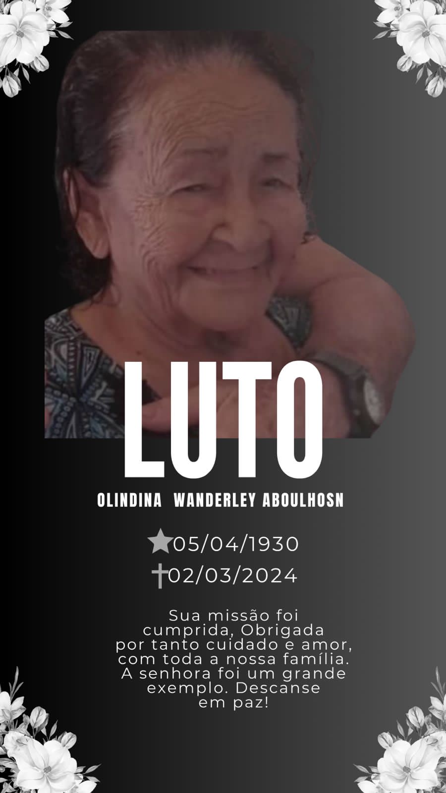 Lúcida, em paz no seu lar em São Félix do Araguaia, a senhora Olindina Wanderley Aboulhosn fechou os olhos para sempre, no sábado, 2 de