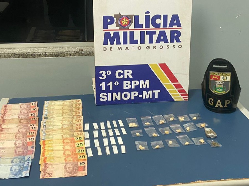 Policiais militares do 11º Batalhão prenderam em flagrante um homem de 20 anos por tráfico de drogas, na madrugada deste sábado (20), em Sinop. Com