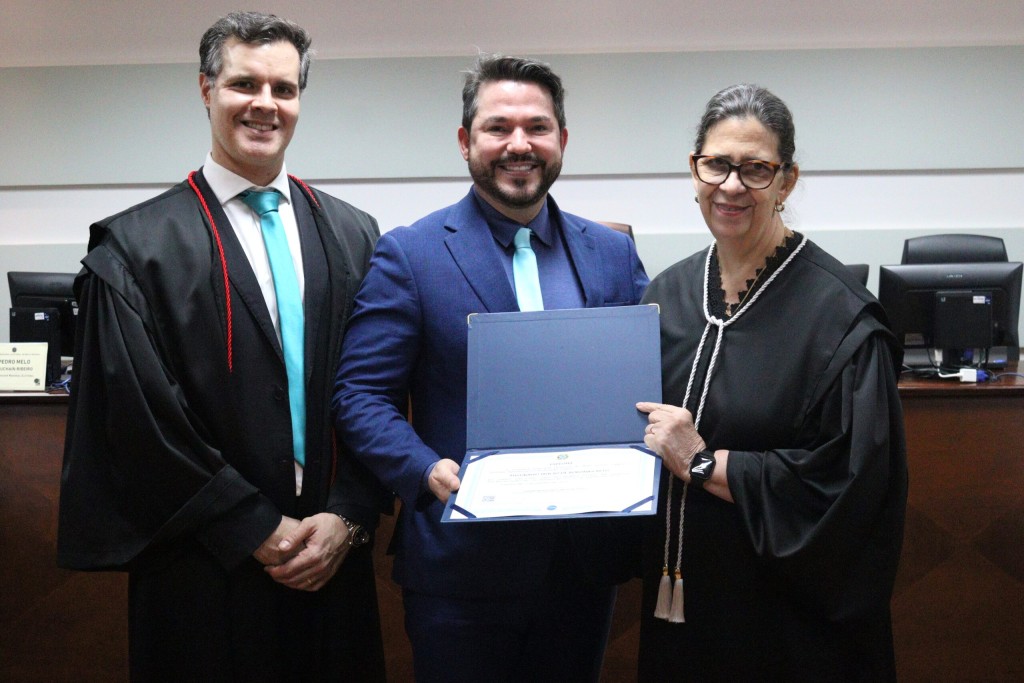 #PraTodosVerem: Foto que mostram o procurador regional eleitoral, Pedro Melo, à esquerda, o ex-juiz-membro Eustáquio Neto, no centro, e a presidente do TRE-MT, desembargadora Maria Aparecida Ribeiro, à direita, sendo que estes dois últimos seguram o diploma recebido por ele. Ao final do texto, tem uma galeria com outras fotos da sessão de despedida.