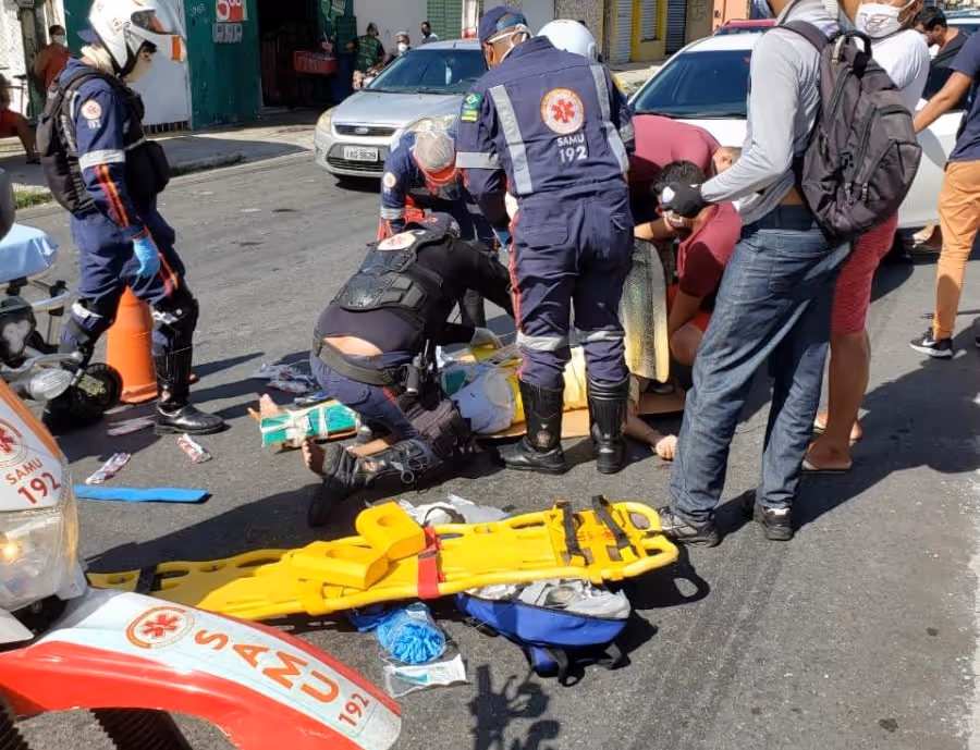 Acidente ocorreu na manhã deste domingo na Avenida Ulisses Pompeu; motociclista quase perdeu a perna e garupa ficou ferido