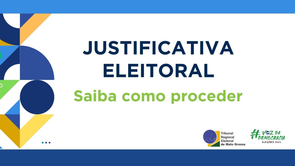 #DescriçãodaImagem: Nela se vê um fundo branco, contendo na lateral a esquerda vários quadriculados coloridos, na parte superior e inferior uma faixa, nas cores azul claro e escuro. Na parte central os dizeres justificativa eleitoral, sabia como proceder. Na parte de baixo constam as logos das eleições e do TRE-MT.