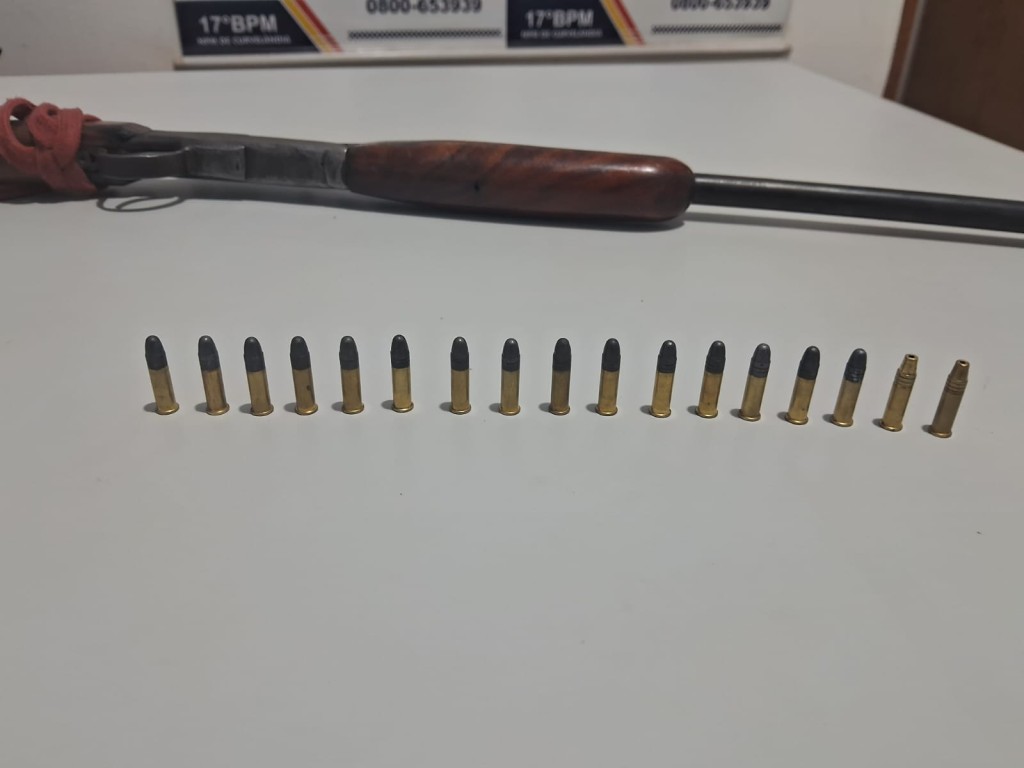 Questionado se havia algo ilícito na residência, o homem confessou que continha uma arma de fogo tipo espingarda calibre 22, sem marca e sem numeração. As equipes ainda apreenderam 17 munições do mesmo calibre. O suspeito e o material apreendido foram encaminhados à delegacia para registro do boletim de ocorrência e demais providências cabíveis.
