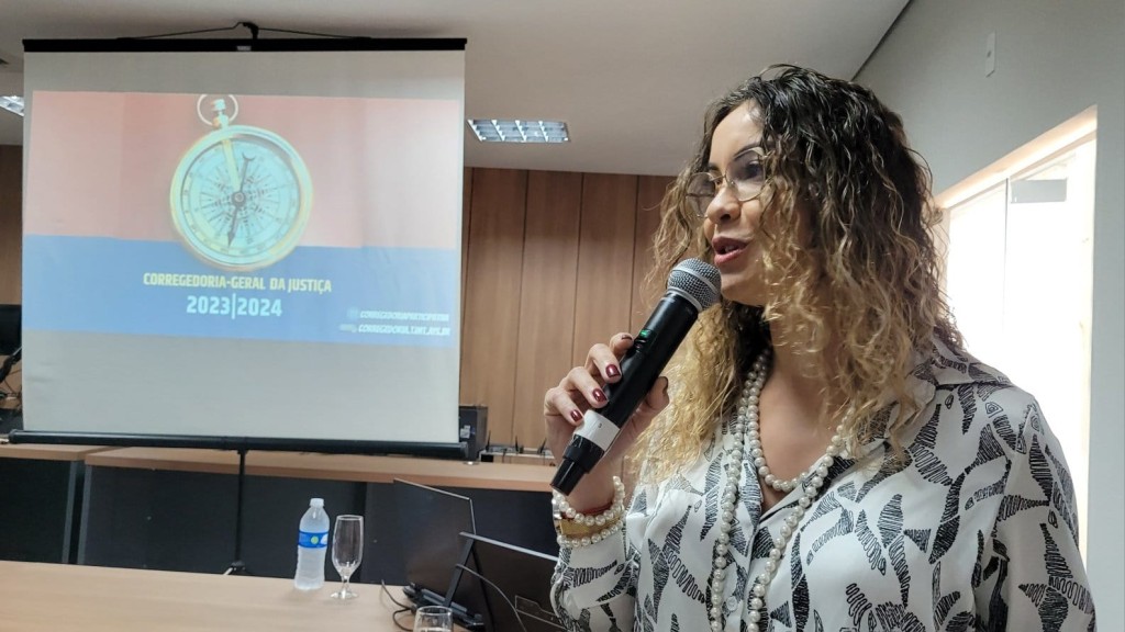 #ParaTodosVerem: esta matéria inclui recursos de texto alternativo para promover a inclusão de pessoas com deficiência visual. Foto 1: a juíza Cristiane Padim fala durante apresentação da Corregedoria, usando camisa branca com detalhes pretos, colar de pérolas e óculos. Ao fundo, um slide com a logo da gestão 2023/24 da CGJ, exibindo uma bússola dourada.