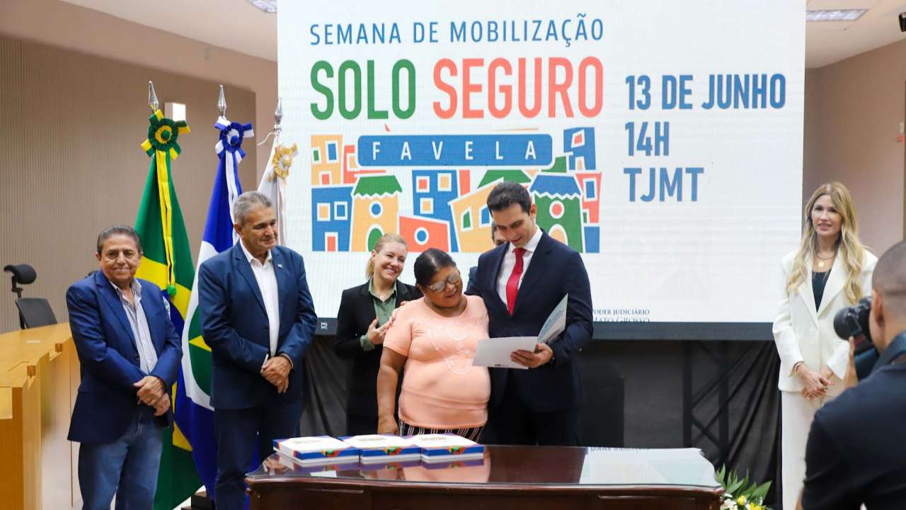 Durante solenidade promovida pelo CNJ e TJMT, em alusão à Semana do Solo Seguro Favelas, a prefeita recebeu títulos do Residencial 8 de Março, que serão um marco dessa nova gestão