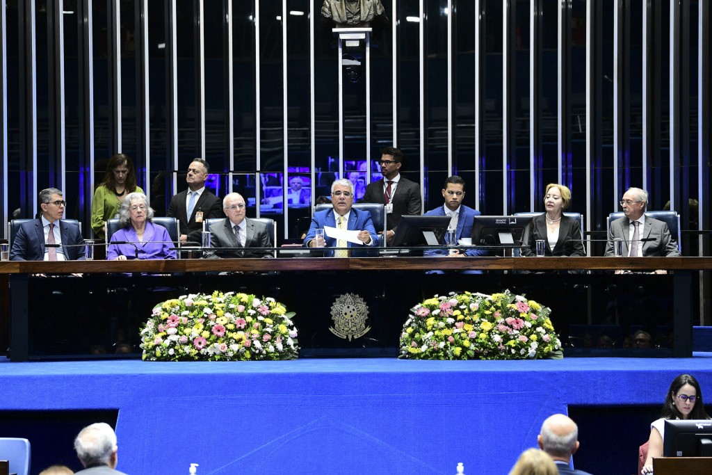 Esta matéria possui recursos de texto alternativo para promover a inclusão das pessoas com deficiência visual. Descrição da imagem: foto horizontal colorida da mesa de autoridades do Plenário do Senado Federal. A presidente Clarice está na segunda cadeira da direita para a esquerda, ao centro está o senador Eduardo Girão e outros magistrados e autoridades sentados nas poltronas. À frente, há o carpete azul do Senado e flores ao chão.