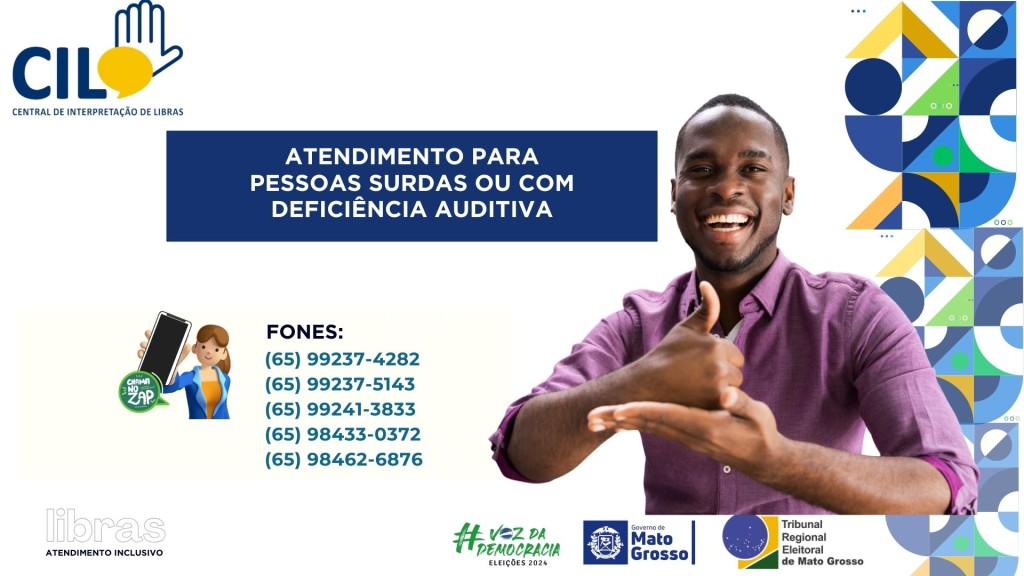 Serviço: Eleitores e eleitoras que precisarem de auxílio da Central de Intérpretes de Libras poderão contar com o atendimento gratuito no TRE-MT nos dias 05 e 06 de outubro. O atendimento será no sábado, 5 de outubro, das 12 às 19 horas e no domingo, 06 de outubro, das 7 às 16 horas, pelos telefones (65) 99237-4282 / (65) 99237-5143 / (65) 99241-3833 / (65) 98433-0372 / (65) 98462-6876.