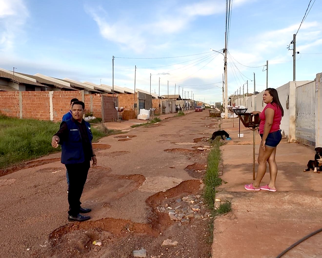 Além do problema hídrico, a situação das vias públicas também preocupa. Em diversas ruas, os moradores enfrentam obstáculos para acessar suas próprias residências por conta de buracos e crateras que colocam em risco a segurança de pedestres e motoristas. Uma das áreas visitadas apresenta uma cratera que ocupa parte da via e ameaça desmoronar a qualquer momento, oferecendo perigo iminente à população.